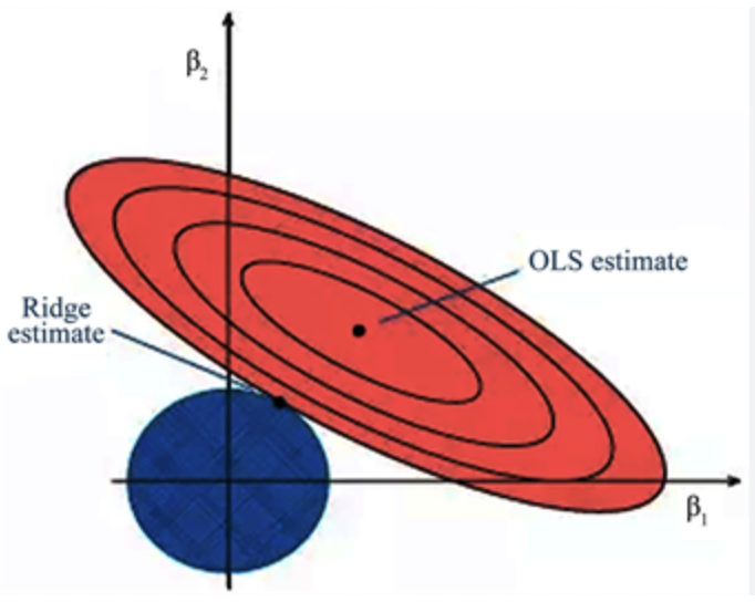 Control how large coefficients may grow \[\arg \min_{\boldsymbol{\beta}} (\mathbf{Y}_c - \mathbf{X}_c \boldsymbol{\beta})^T (\mathbf{Y}_c - \mathbf{X}_c\boldsymbol{\beta})\] subject to \[ \sum \beta_j^2 \le t\]