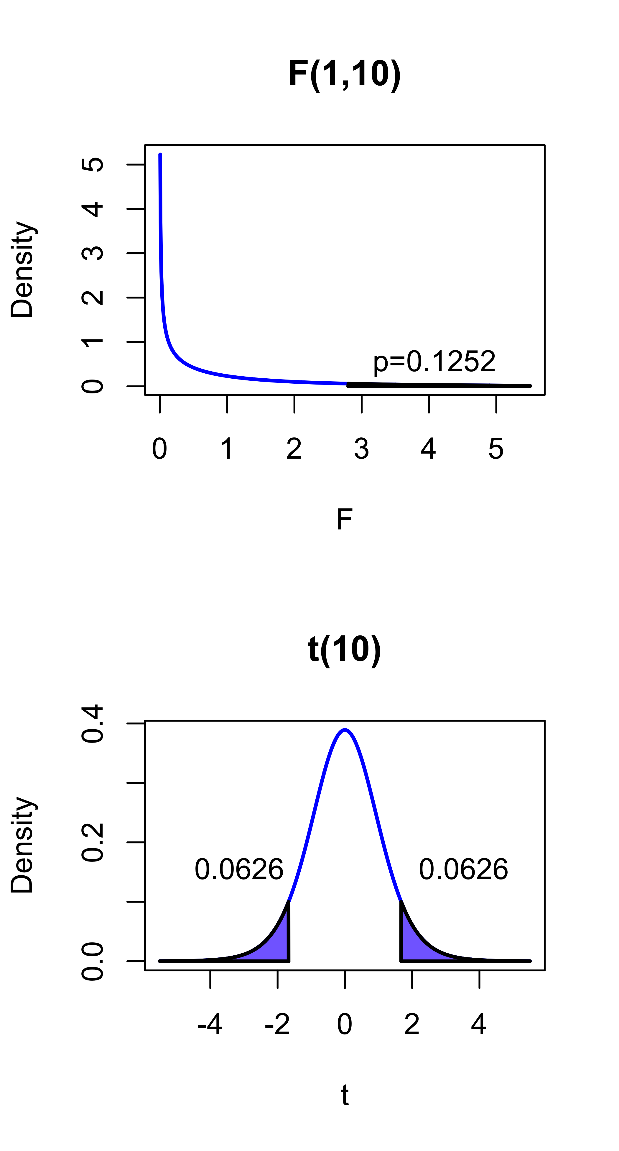 an \(F_{1, \nu}\) is equal in distribution to the square of Student \(t_{\nu}\) distribution under the null model (also equal in distribution under the full model, but have a non-centrality parameter)