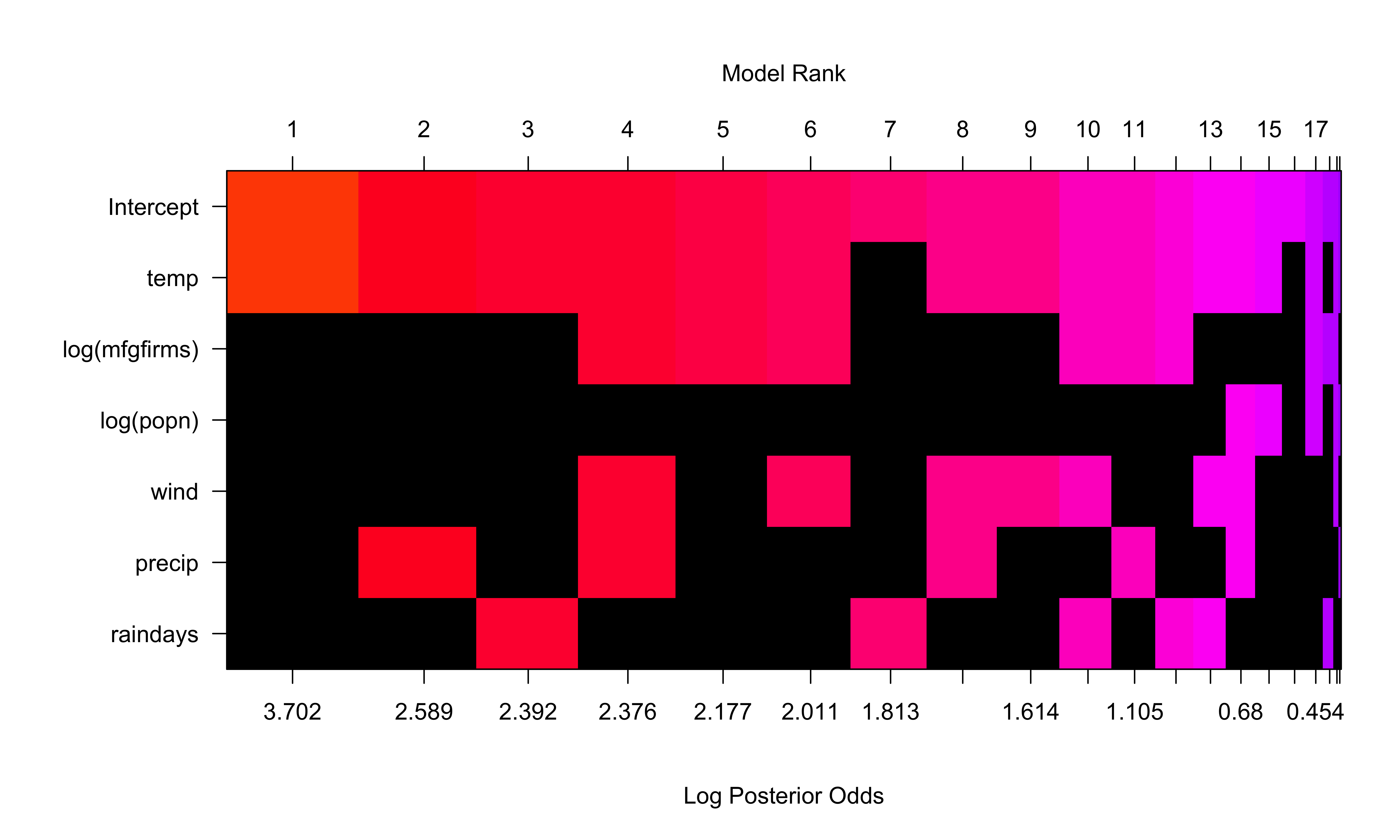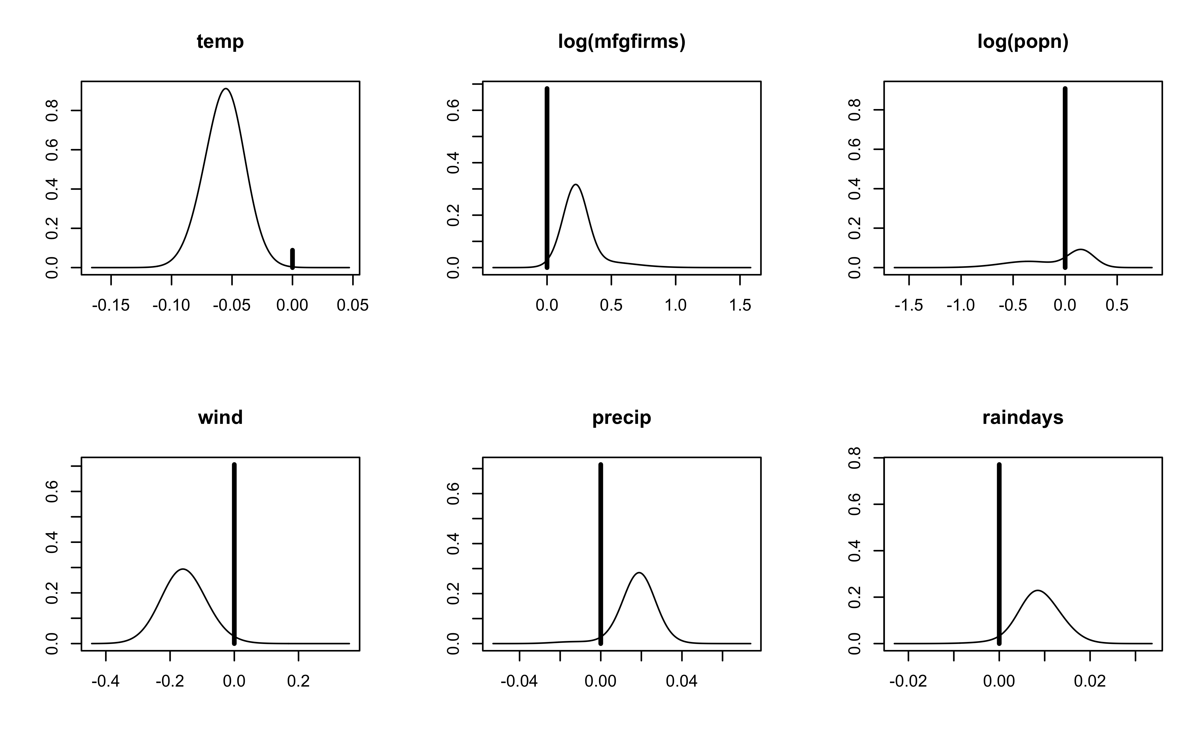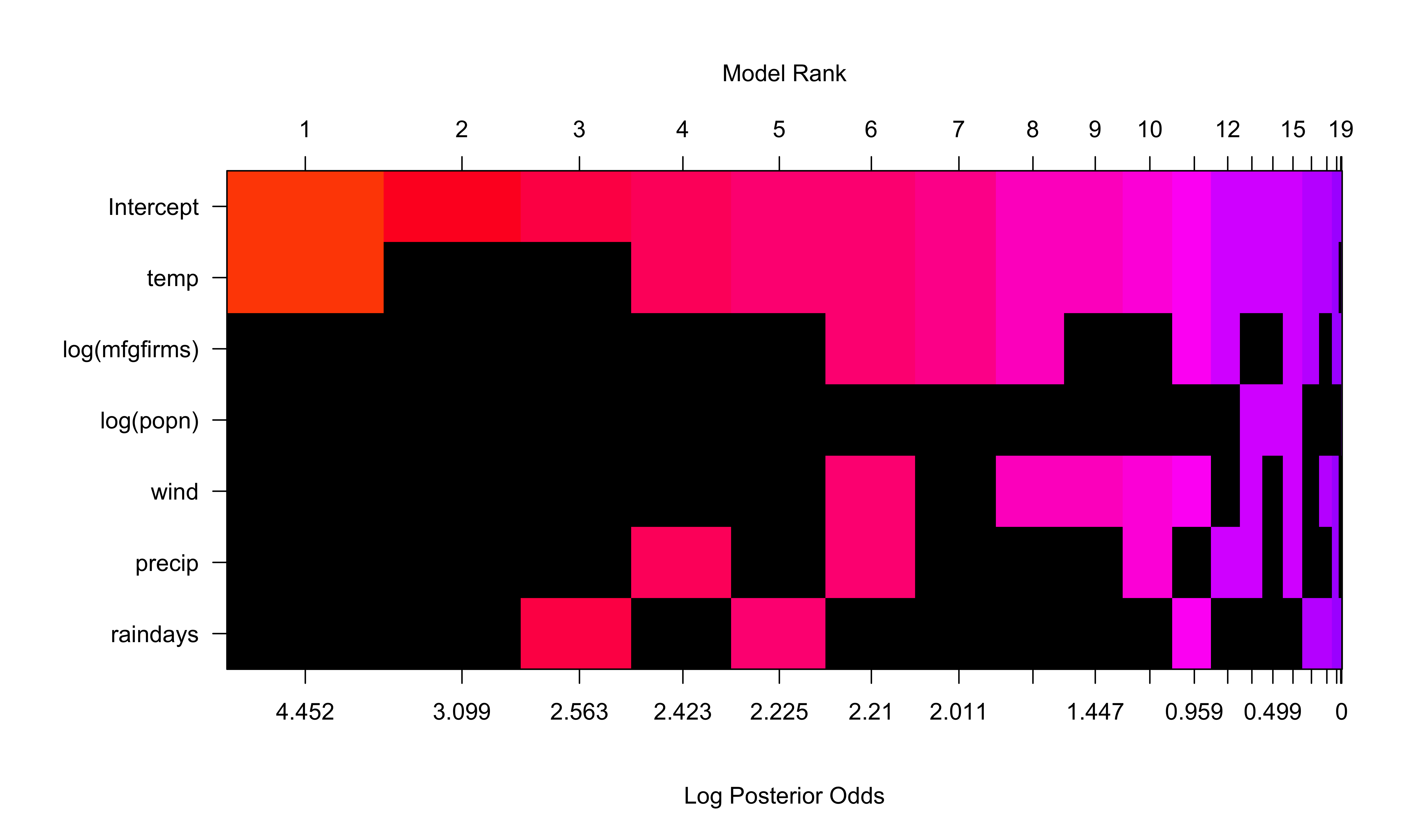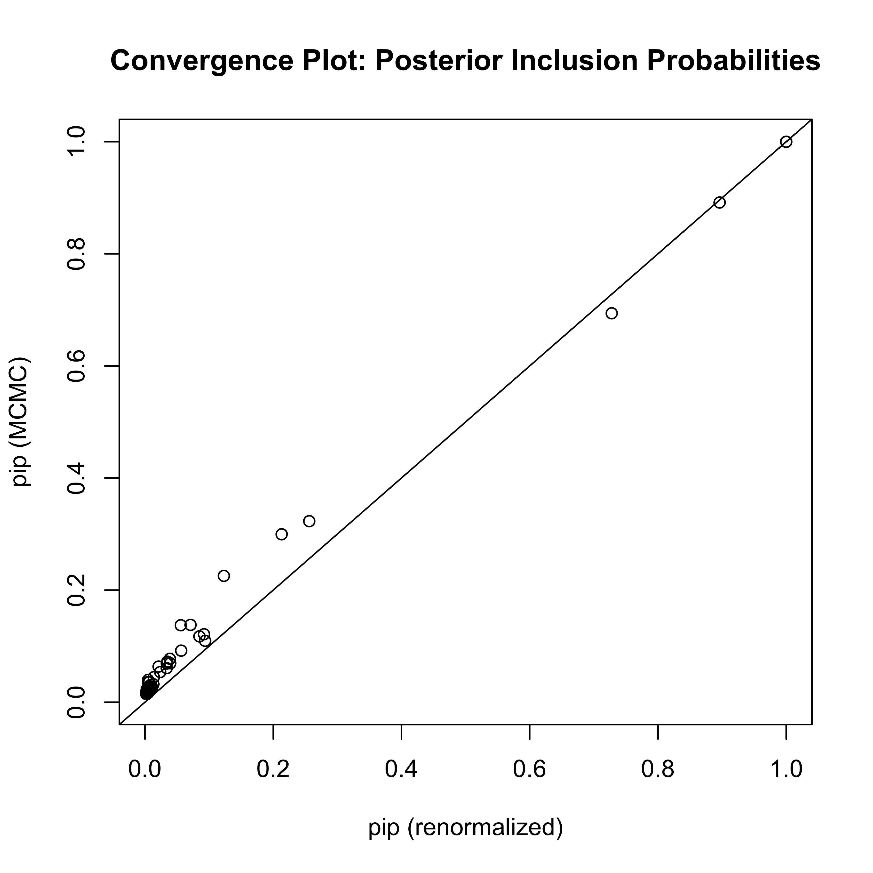 also look at other summaries i.e posterior inclusion probabilities \[\hat{p}(\gamma_j = 1 \mid \mathbf{Y}) = \sum_S \gamma_j \hat{P}(\boldsymbol{\gamma}\mid \mathbf{Y})\]