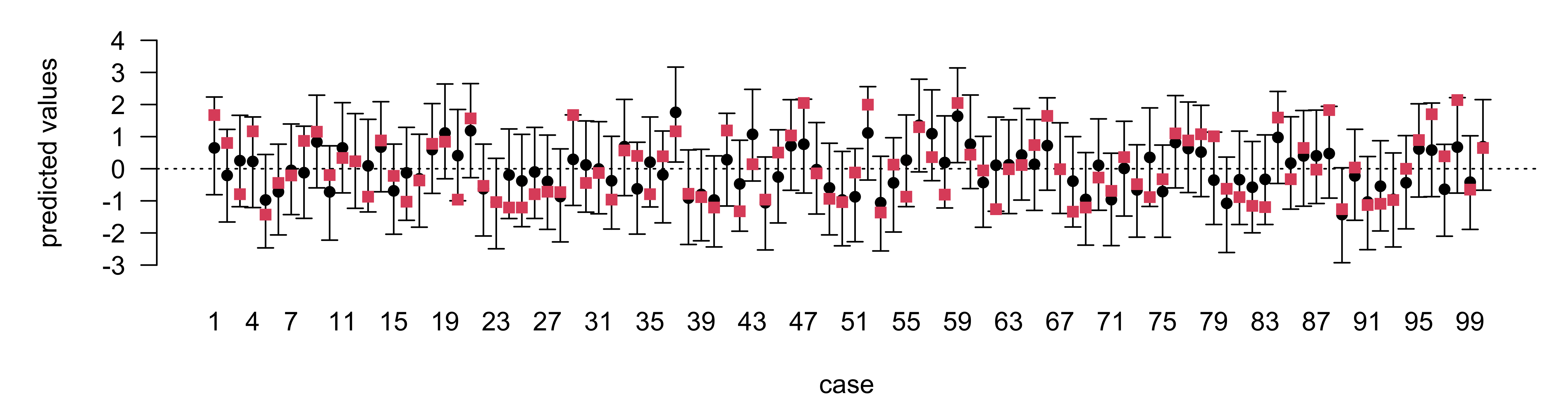 Prediction under model averaging \[\hat{Y} = \sum_S (\hat{\alpha}_\boldsymbol{\gamma}+ \mathbf{X}_{\boldsymbol{\gamma}}^{\text{test}} \hat{\boldsymbol{\beta}}_{\boldsymbol{\gamma}}) \hat{p}(\boldsymbol{\gamma}\mid \mathbf{Y})\]