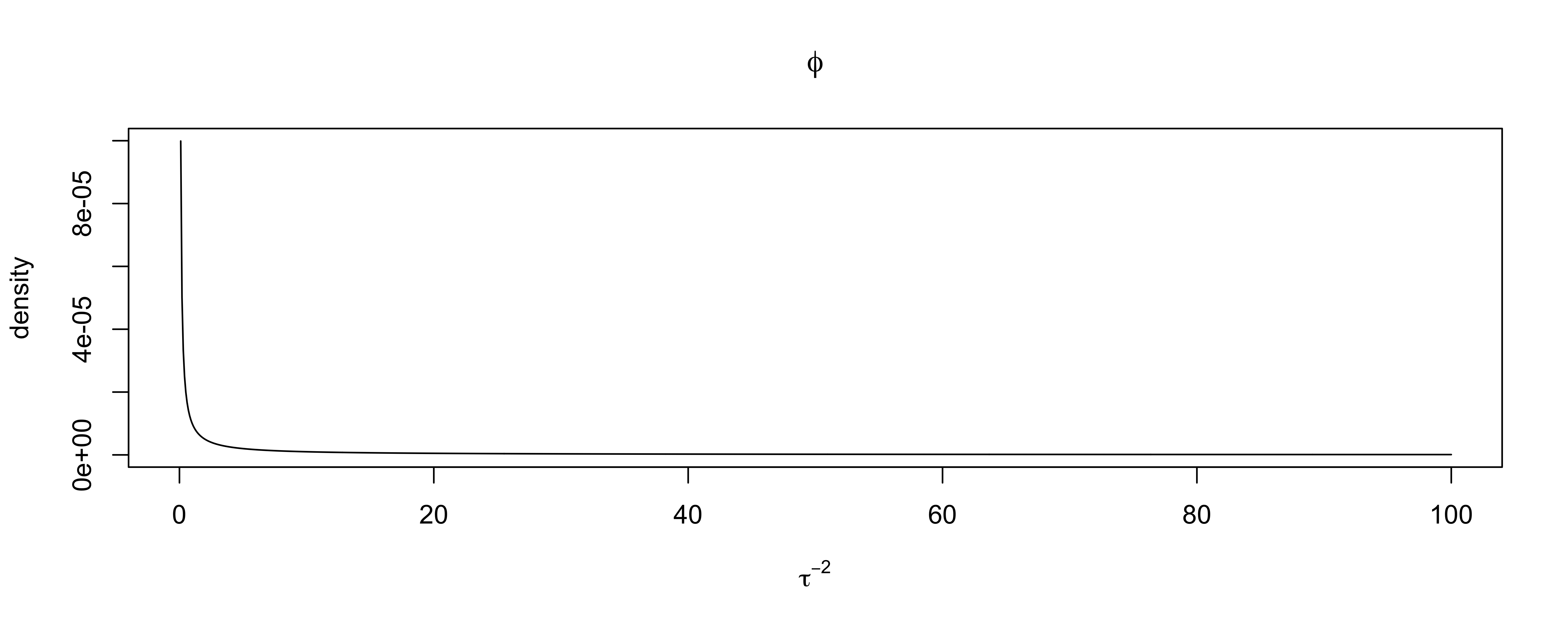 Early recommendation after Gibbs Sampler used non-informative priors \[\begin{align*} \pi(\alpha) & \propto 1 \\ \pi(\phi_\sigma) & \sim \textsf{Gamma}(\epsilon/2, \epsilon/2) \qquad \pi(\phi_\sigma ) \propto 1/\phi_\sigma \text{ as } \epsilon \to 0 \\ \pi(\phi_\tau) & \sim \textsf{Gamma}(\epsilon/2, \epsilon/2) \qquad \pi(\phi_\tau) \propto 1/\phi_\tau \text{ as } \epsilon \to 0 \end{align*}\]